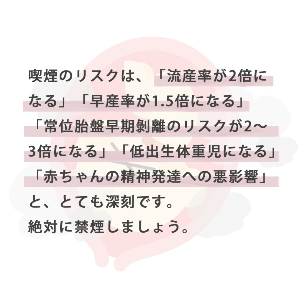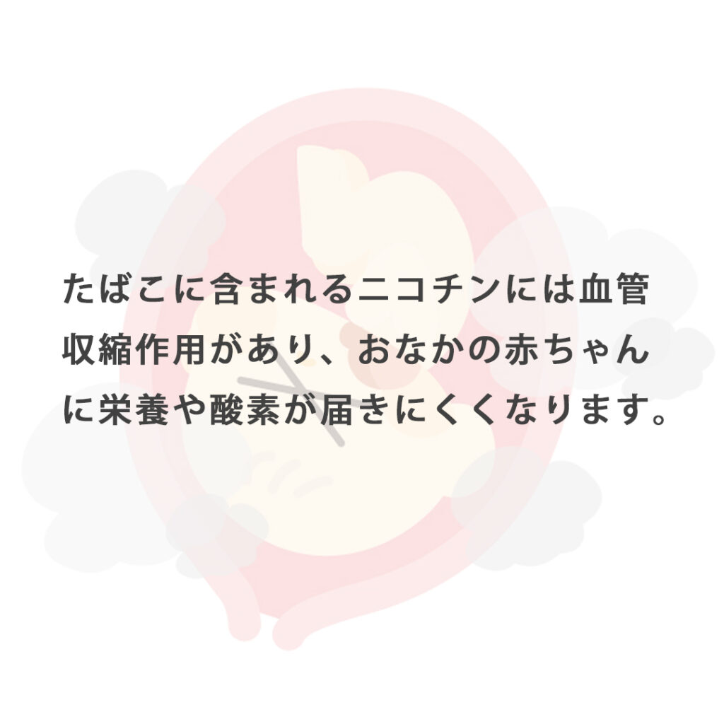 たばこに含まれるニコチンには血管収縮作用があり、おなかの赤ちゃんに栄養や酸素が届きにくくなります。