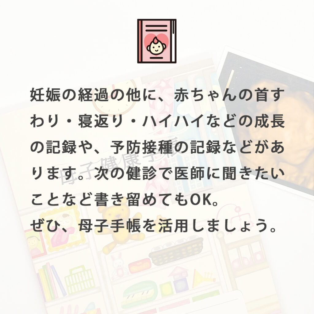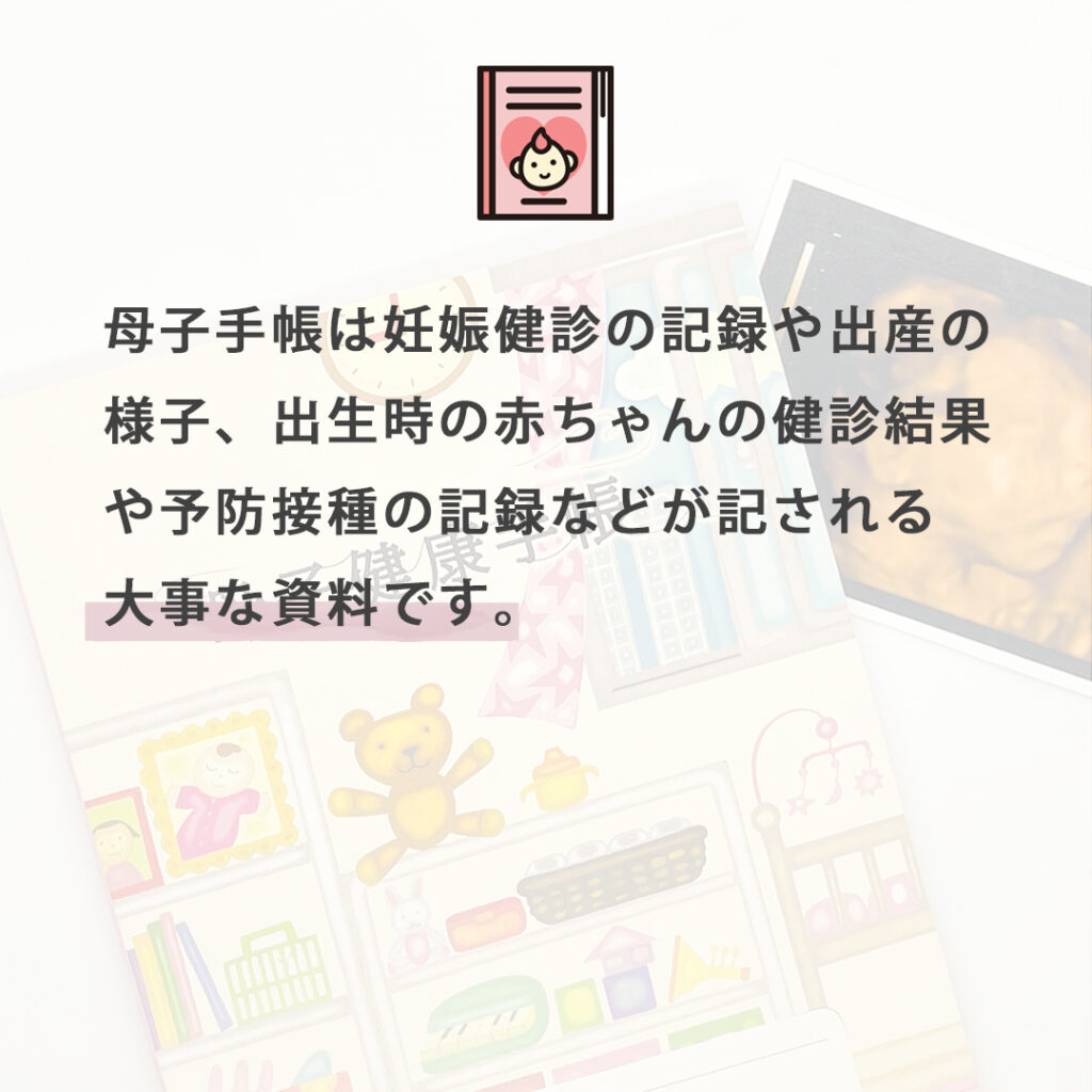 妊娠健診の記録や出産の様子、出生時の赤ちゃんの健診結果や予防接種の記録などが記される大事な資料です。