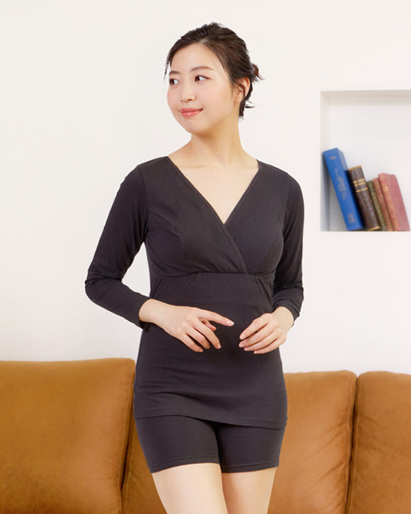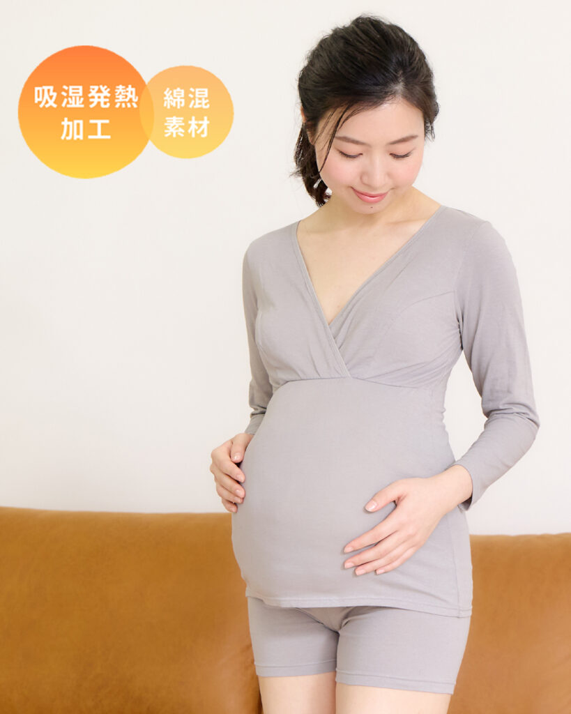 吸湿発熱加工を施した綿ベア天竺素材の9分袖マタニティ授乳インナー!