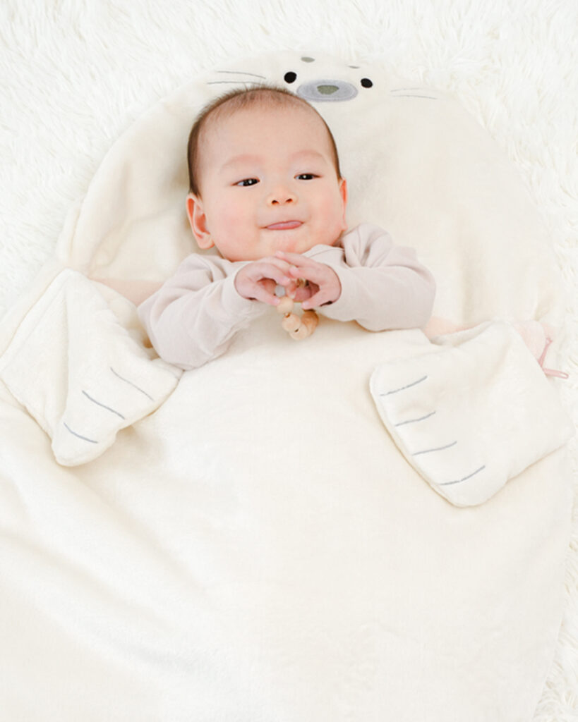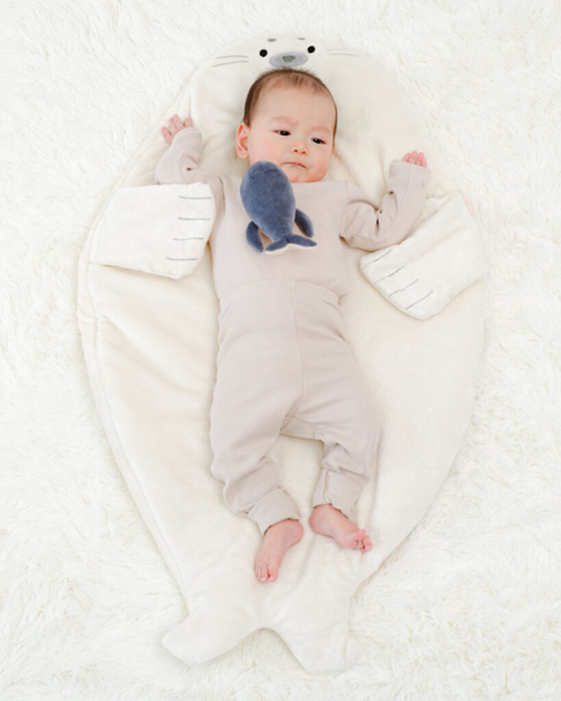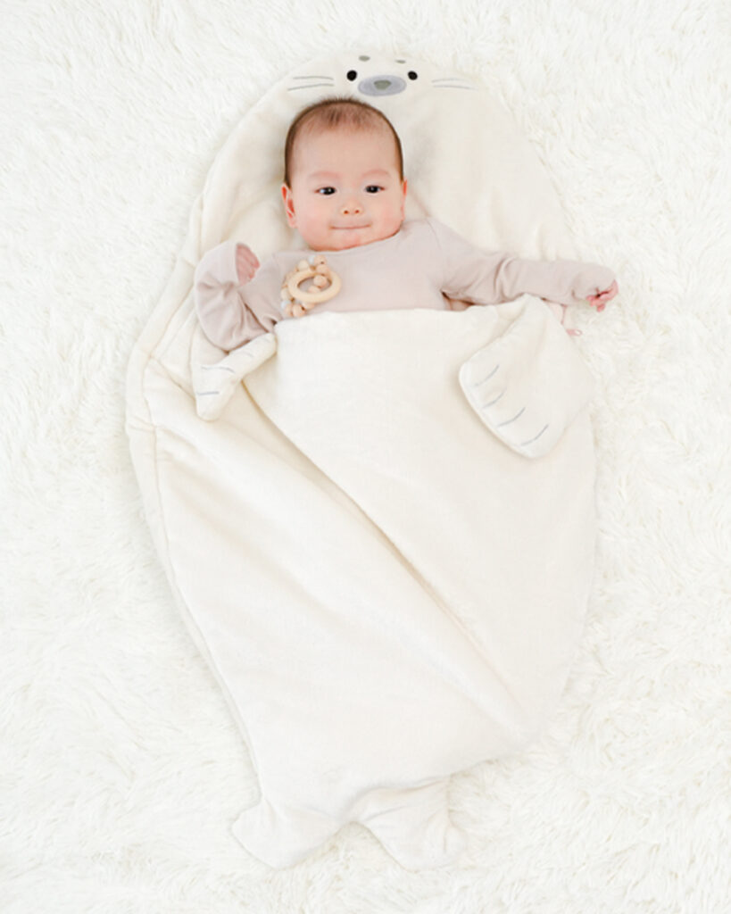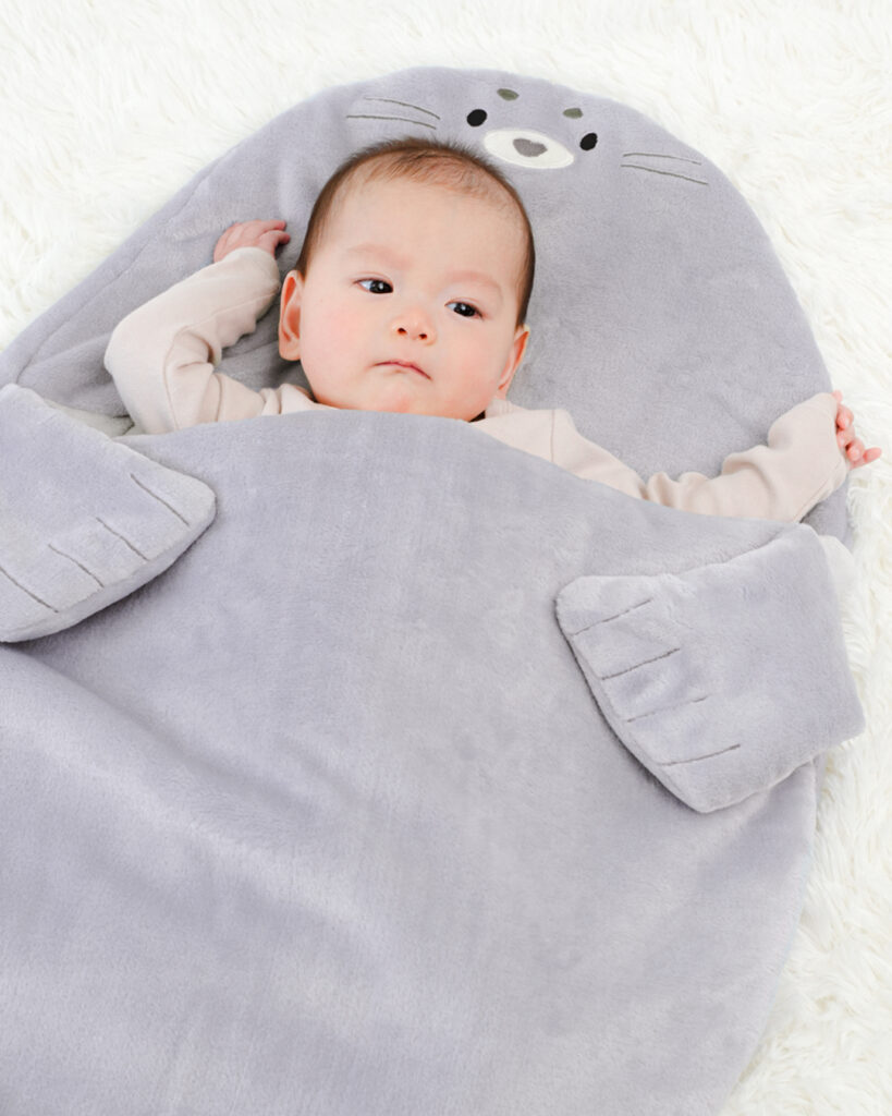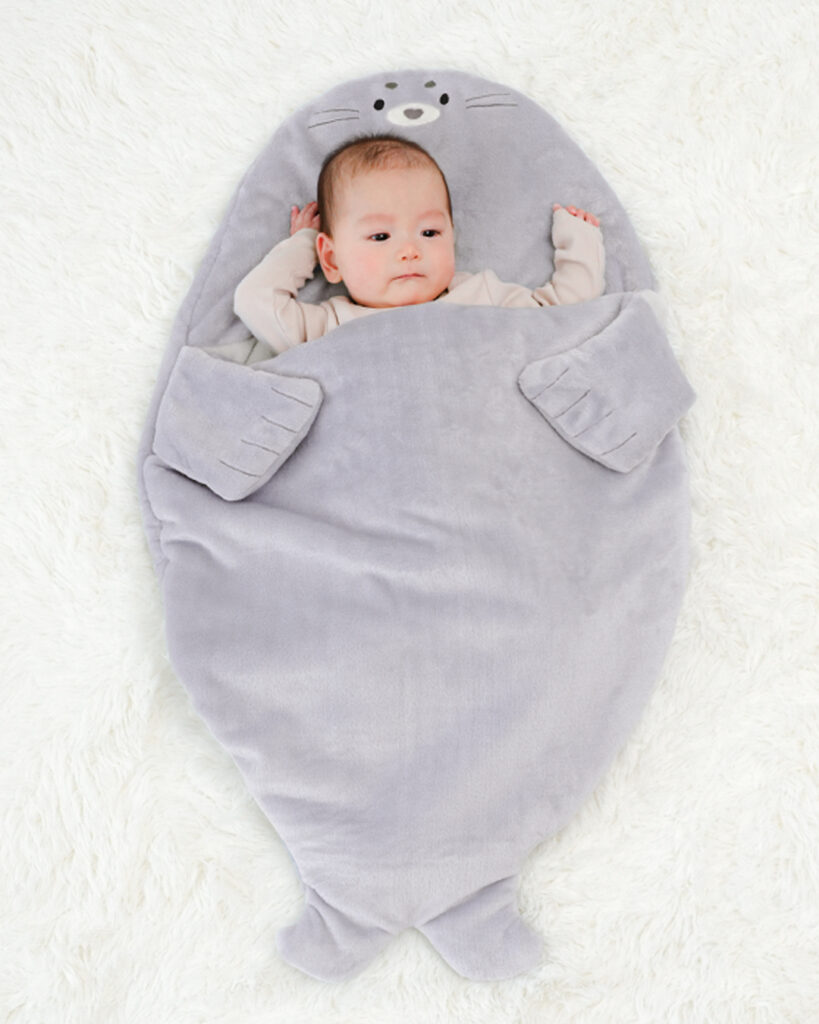 お腹の上で可愛いおててがそっと抱きしめてくれるあざらしのスリーピングバッグ!