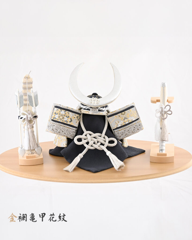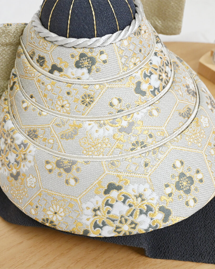 夢み屋オリジナルの金襴生地を使用した、格調高い兜飾り。艶のある白地に織り込まれた金糸が、光を受けて模様を浮かび上がらせ、上品で華やかな印象を与えます。織物の中でも最高位に位置づけられる素材です。