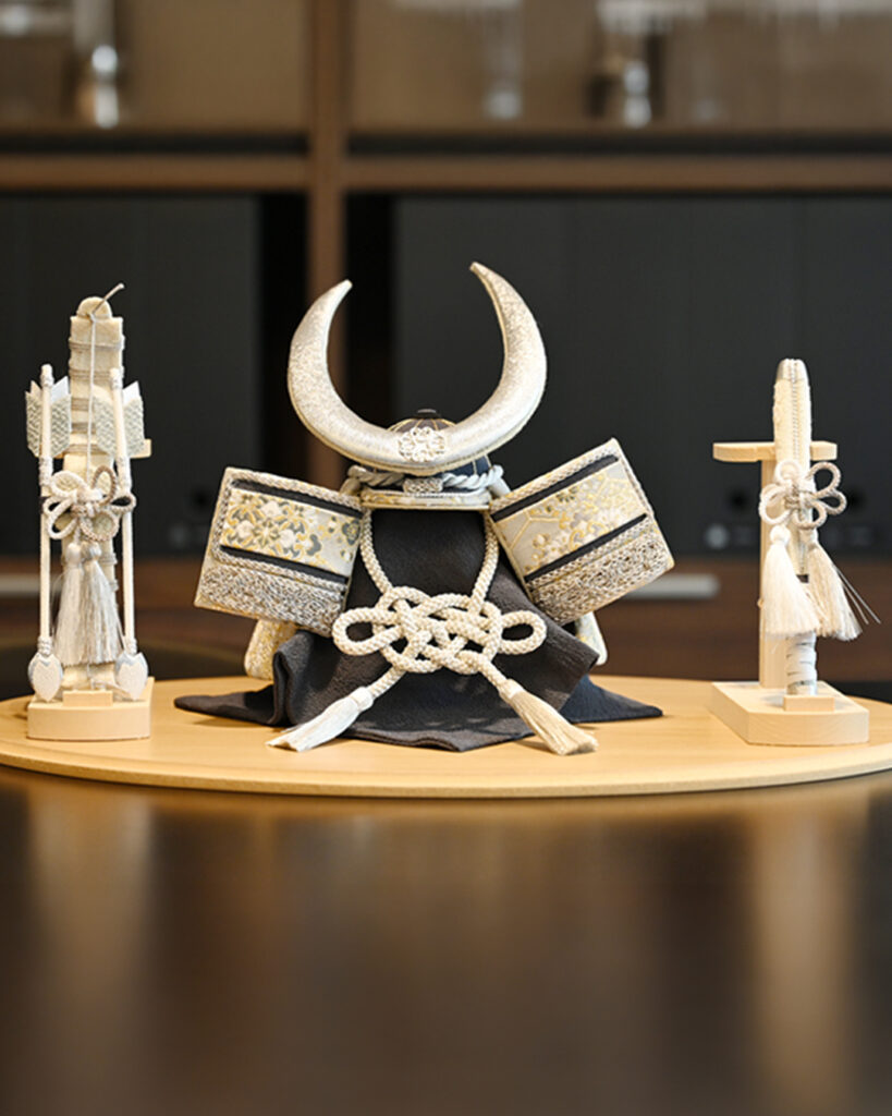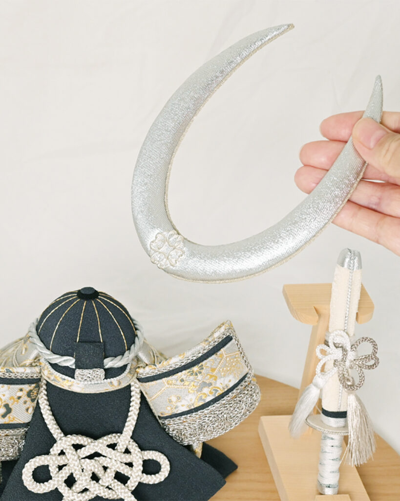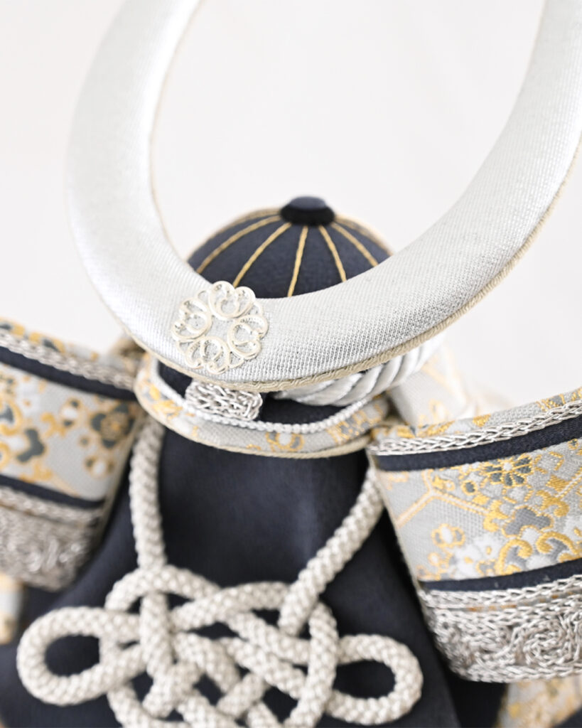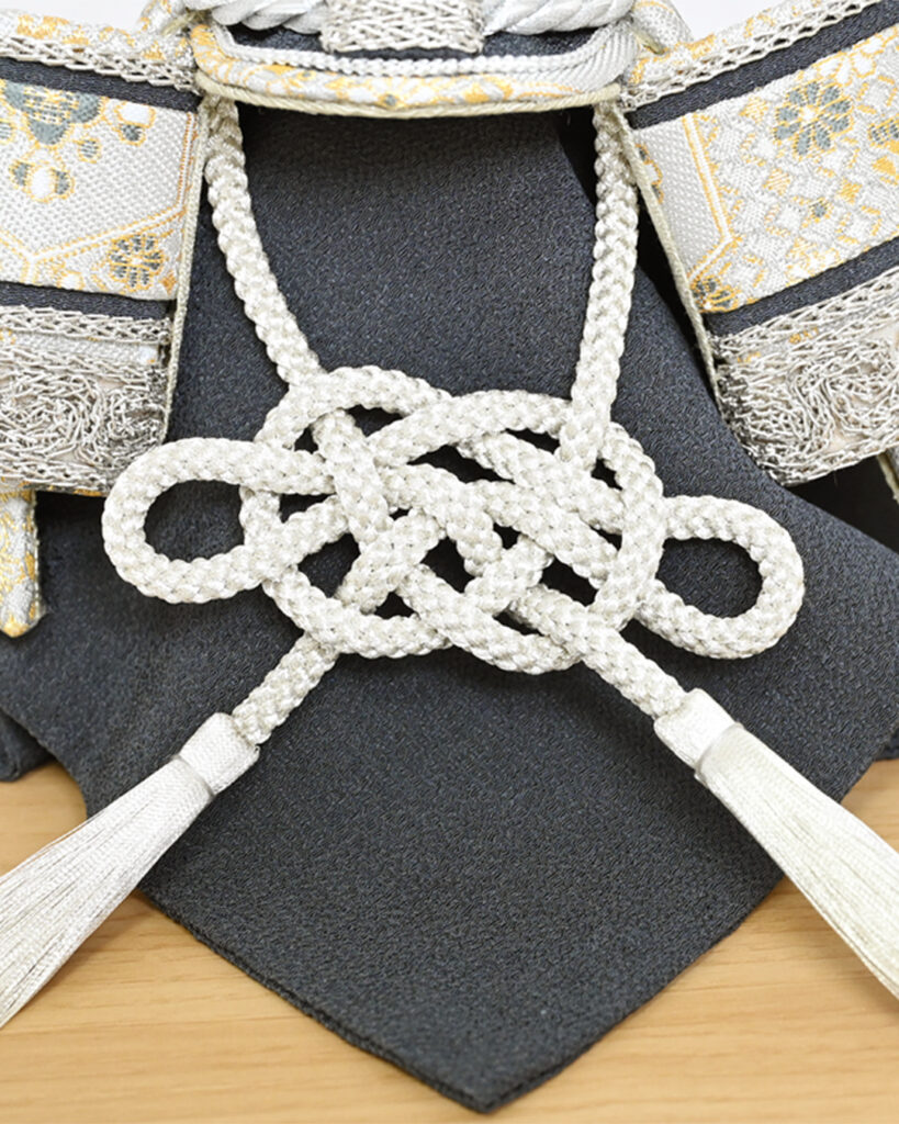 煌びやかな兜飾りの忍緒には、伝統の京組紐を用いた「無双結び」を採用。この結びには、生命力を込めるという願いが込められています。美しさと意味を兼ね備えた、特別な仕上がりです。