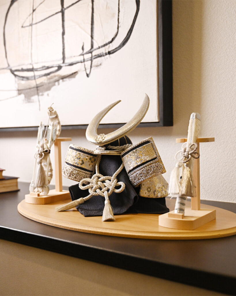 長く伸びた弓は「神様が降りて宿るもの」とされ、神聖な存在を象徴する飾りです。一方、太刀は「人を傷つけない儀式と護身のためのもの」として飾られ、平和への願いが込められています。どちらも「邪気や魔が近寄らないように」という魔除けの意味を持ち、お子様の健やかな成長を願う節句飾りとして、より一層意味深く、美しい佇まいに仕上がりました。
